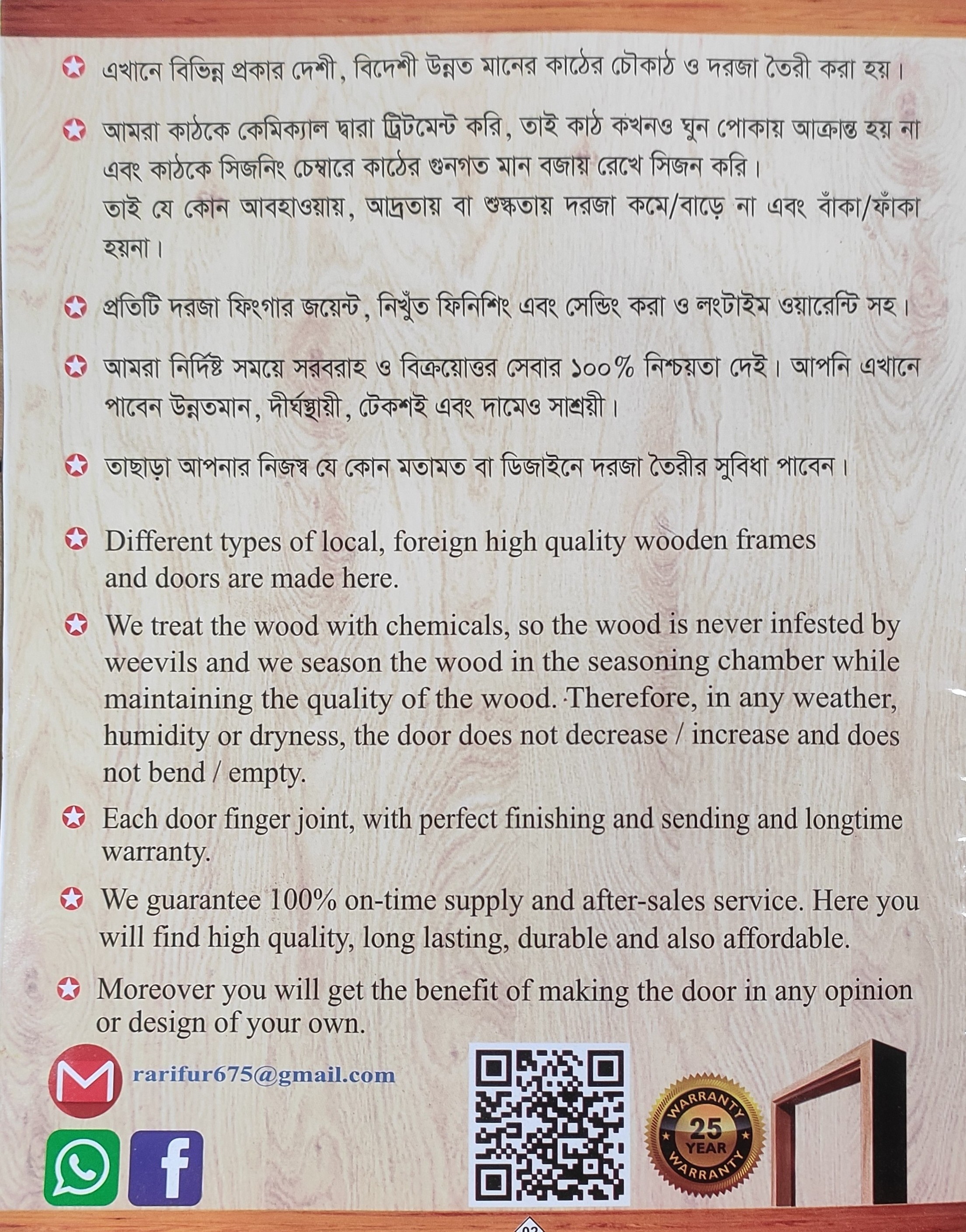 আমাদের নিজস্ব প্রতিষ্ঠানে অভিজ্ঞ কারিগর দ্বারা সকল প্রকার উন্নতমানের দেশী-বিদেশী কাঠের দরজা-ফ্রেম ও ফার্নিচার তৈরি হয়।